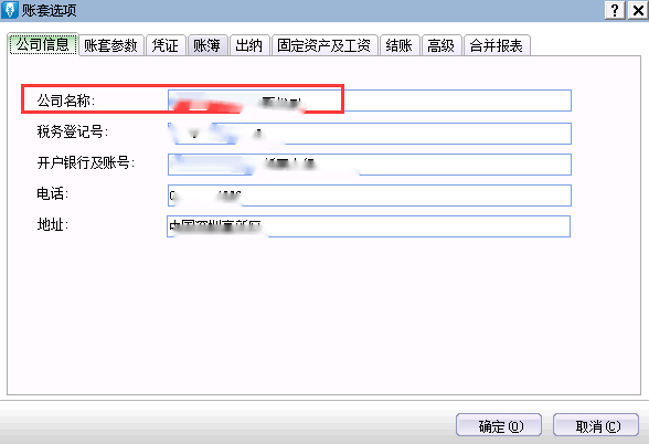 2、在[账套参数]页签,[账套名称]文本框中键入正确的单位名称,单击[确定]按钮保存设置。