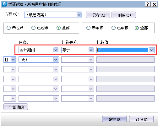 (注:如果是查询某一期间的全部凭证,则“过账”状态和“审核”状态都需要选到“全部。)