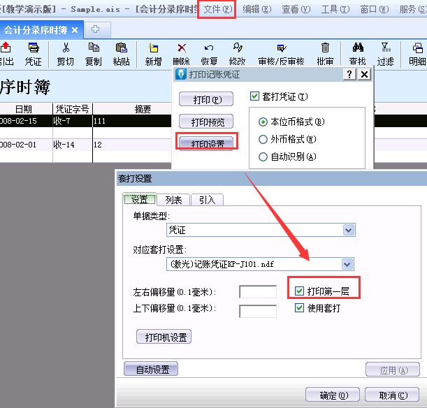 会计分录序时簿界面,点击右上角[文件]-[工具]-[套打设置]-勾选[打印第一层]参数。