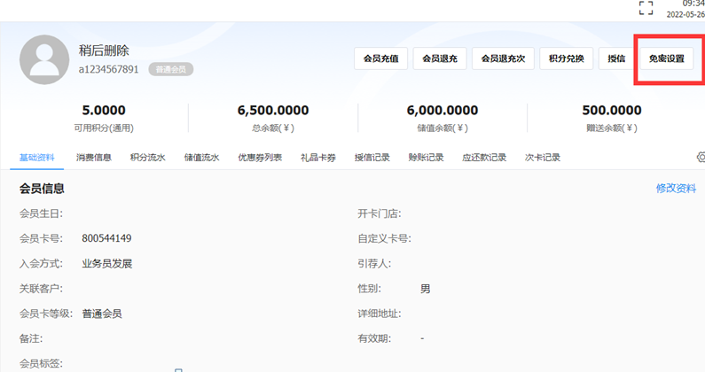 方式二:登陆POS端—【会员】—选择一个会员,点击右上角【免密设置】,可设置跟随全局设置,或另外设置免密额度。