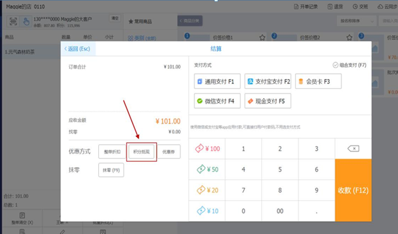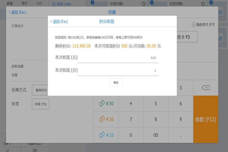【说明】:因积分为整数,当录入本次抵现金额后折算的积分不为整数时,默认向上取整。如下图所示,积分规则为每10分抵1元,此时,录入本次抵现金额0.01元,折算后的抵现积分应为0.1,向上取整后为1,因此,本单需要消耗的积分数量为1