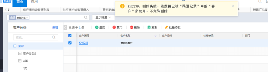 删除客户时,提示客户已被“跟进记录”中所使用;如下图所示: