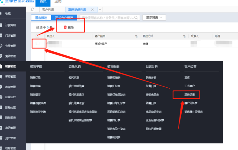 金蝶云•星辰删除客户,提示:KH0236: 删除失败,该数据已被“跟进记录”中的“客户”所使用,不允许删除,应该如何处理?