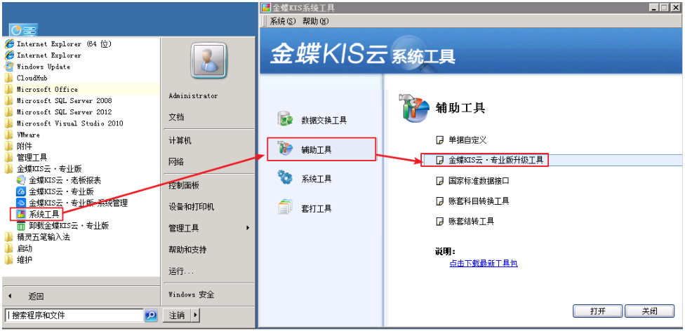 具体操作:通过 【开始】→【所有程序】→【金蝶KIS云·专业版】→【系统工具】→【辅助工具】→【KIS云·专业版升级工具】;