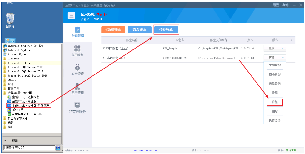具体操作路径:在金蝶KIS私有云服务器上,通过【开始】→【所有程序】→【金蝶KIS云·专业版】→【金蝶KIS云·专业版-系统管理】→【账套管理】界面,使用【恢复账套】功能,恢复低版本的账套,点击该账套的【更多】→【升级】。