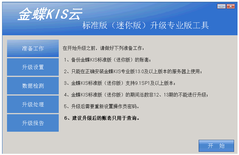 打开工具后请仔细阅读文字,将引导您顺利升级到金蝶KIS云·专业版V16.0。