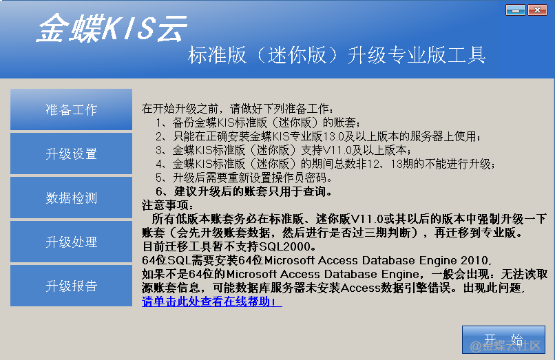 按照功能路径,进入【金蝶KIS云标准版(迷你版)升级专业版工具】界面,在升级前,请您先详细阅读说明,单击【开始】,进入升级前设置界面。