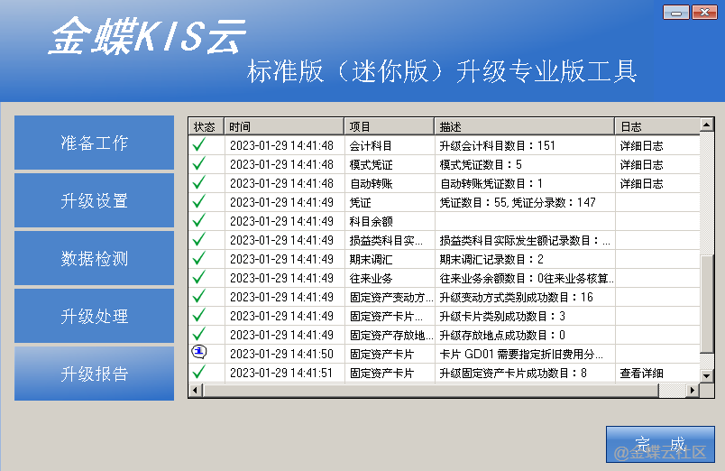 升级完成后,系统会直接根据升级结果,生成升级报告。请详细阅读升级报告,报告中会给出详细升级成功数据说明。如果遇到账套数据异常,无法正常升级,也会在报告中给出详细说明。点击查看详细,同样能查询到详细的日志说明。