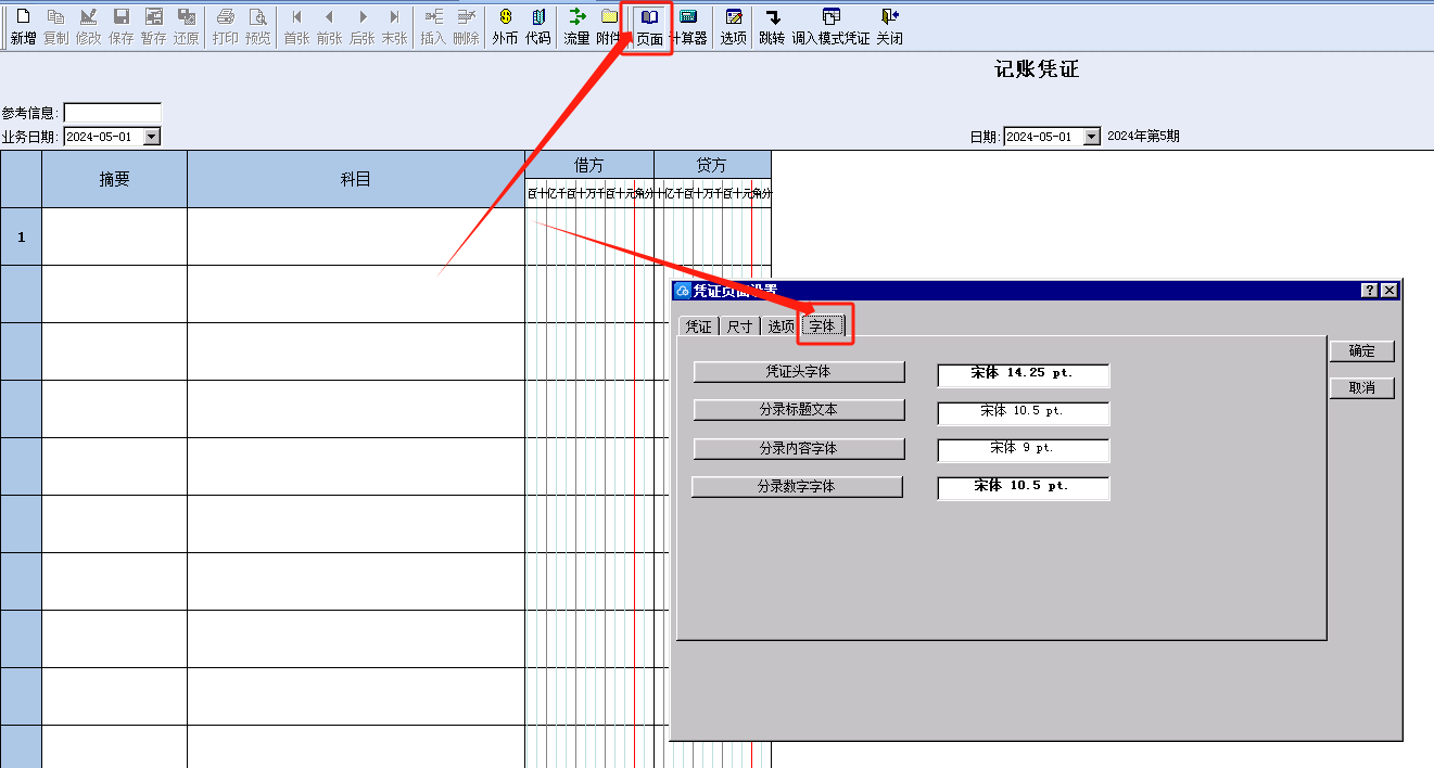 凭证录入界面的分录和凭证头字体均可单独调整,点击凭证录入界面工具栏中的【页面】-选择【字体】页签,在此处调整。具体如图示: