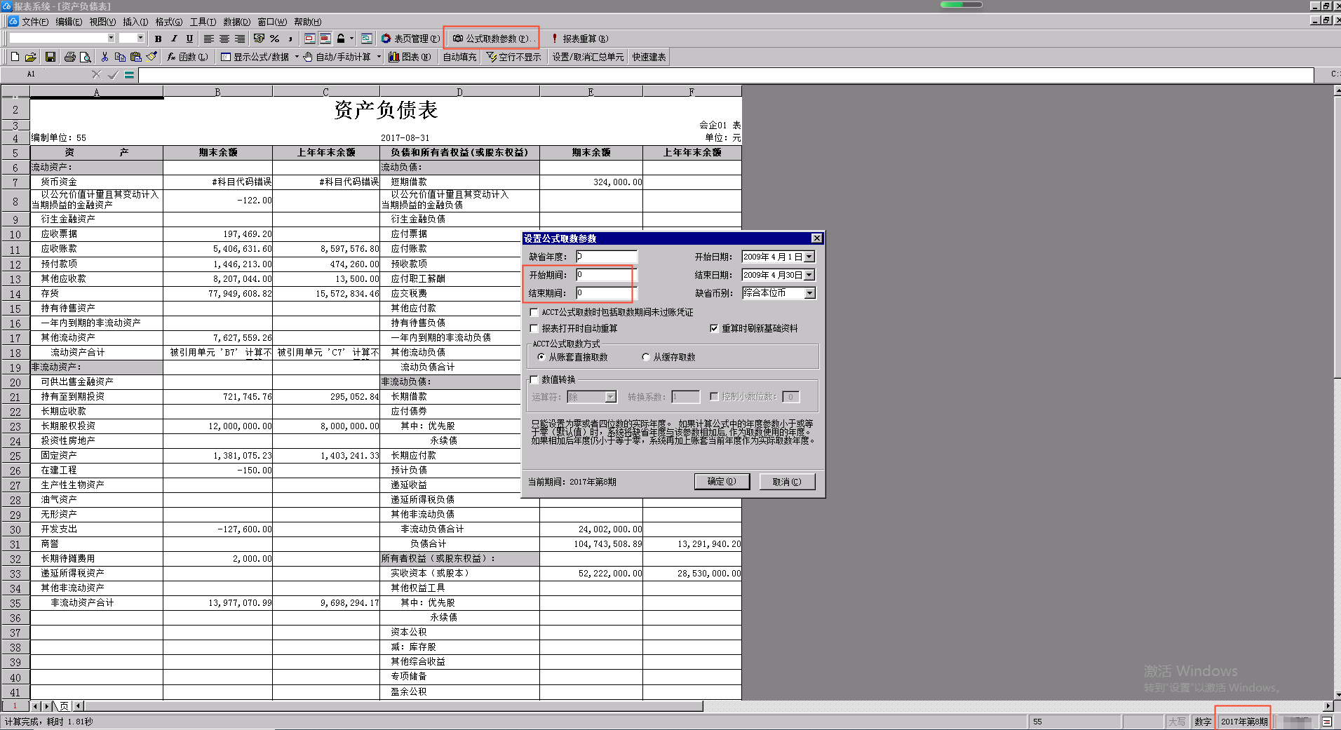 [概述]报表右下脚显示的期间是指报表的取数期间,受控于[公式取数参数]中设定的缺省年度、开始期间、结束期间来;如果要跟总账期间一致,可将缺省年度、开始期间、结束期间都设置为0。