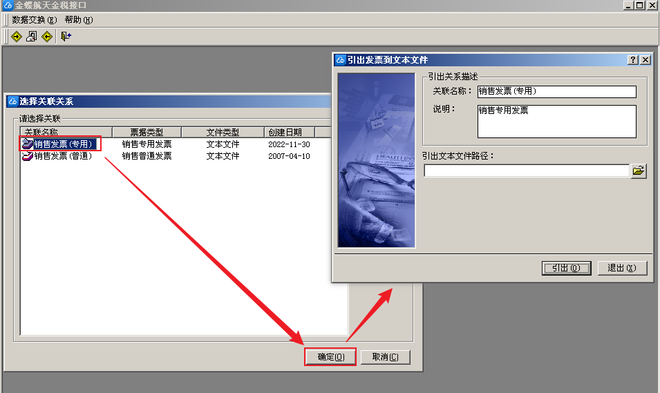 1. 在【选择关联关系】窗口,选择需要引出的管理,点击【确定】,系统调出【引出发票到文本文件】窗口;