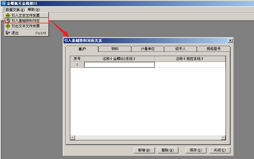 1. 在【引入基础资料对应关系】窗口,可对客户、物料、计量单位、经手人和规格型号进行【新增】、【删除】的对应设置,在【名称(金蝶KIS系统)】字段列选择基础资料,再在【名称(税控系统)】列填入发票中要引入的值。