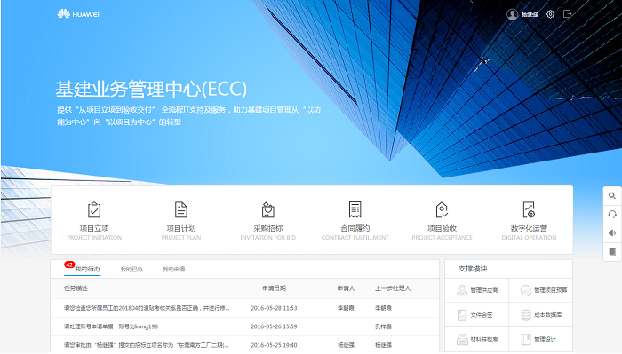 随着华为在全球各地分部的快速增长,华为内部基础设施每年建设资金40-50亿元,且预计建设高峰还将持续5-10年。2012年-2015年,华为基建确定基于金蝶EAS BOS平台开发华为内服基建业务管理平台(ECC),并不断推广优化改进。ECC系统业务涵盖基建项目管理、供应商管理、采购招投标、预算验收等众多领域,业务及交互逻辑十分复杂。