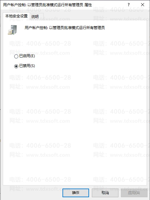 双击打开后,选择点选“已禁用”并确定,即可完全关闭用户账户控制,如下图所示。