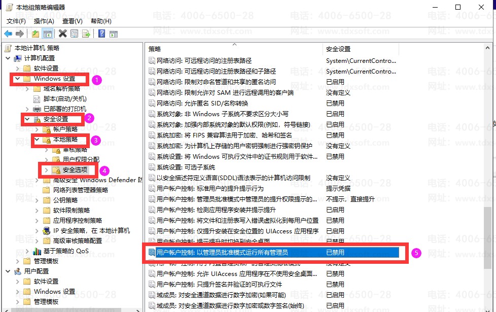 在本地组策略编辑器界面中依次展开【计算机配置】→【Windows设置】→【安全设置】→【本地策略】→【安全选项】,在右侧栏找到并双击打开【用户账户控制:以管理员批准模式运行所有管理员】,如下图所示。