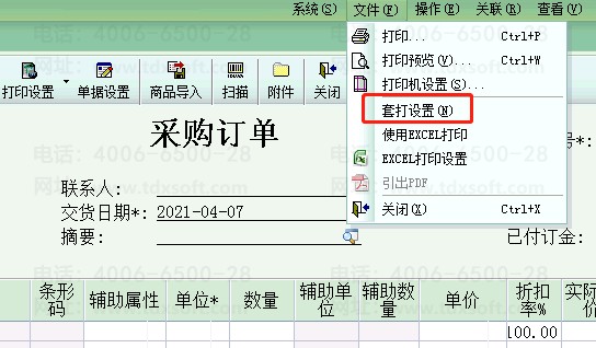 单击[采购管理]-[购货单],单击右上角菜单栏[文件]-[套打设置],勾选[不打印空白行]即可。