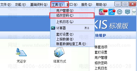 方法一:使用需要修改密码的操作员登录账套,单击[系统维护]—[修改密码]输入旧密码以及新密码进行修改;