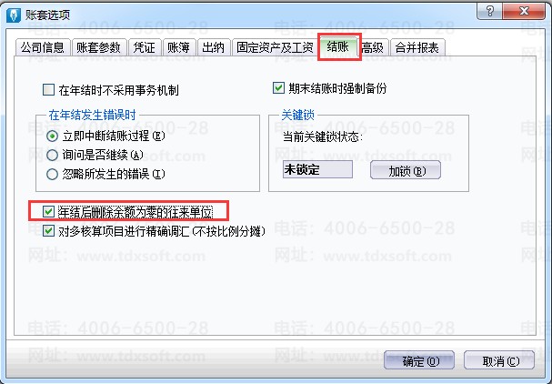 2、单击[高级]-[结账],勾选[年结后删除余额为零的往来单位]参数。