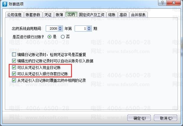 打开[系统维护]-[账套选项]-[出纳],勾选参数“可以从凭证引入现金日记账”、“可以从凭证引入银行存款日记账”。如图所示: