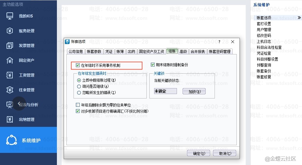 在【系统维护】-【账套选项】-【结账】中勾选“在年结时不采用事务机制”参数,再进行结账即可。