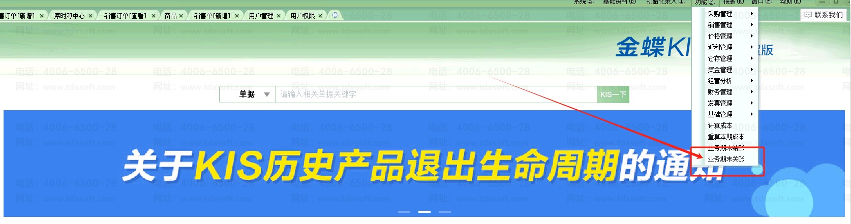 2、单击右上角[功能]—[业务期末关账]操作即可;