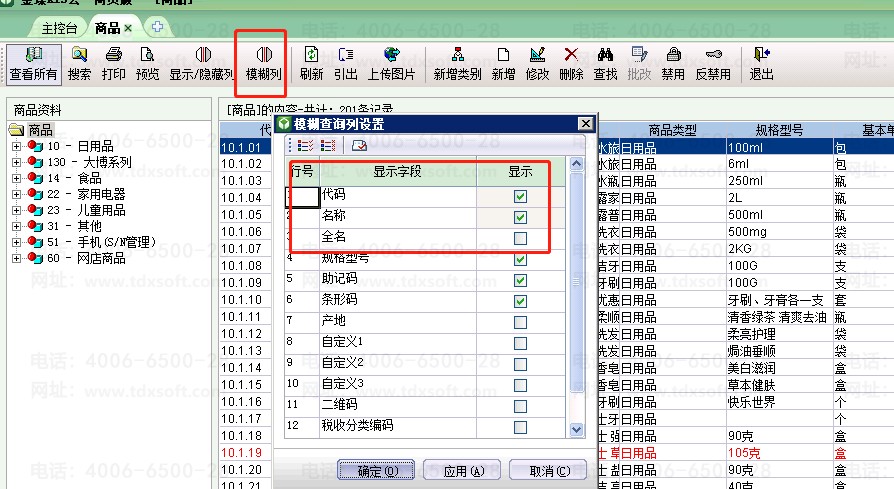 点击基础资料-商品进入商品界面,点击表头模糊列按钮,模糊查询设置里勾选或取消字段使用。