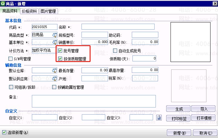 单击右上角[基础资料]-[商品]-[商品],选择具体的商品,勾选[批号管理]和[按保质期管理]。