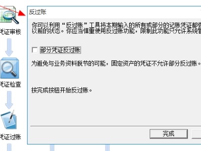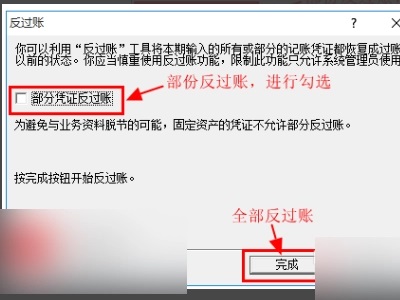 3、在弹出的反过账选项框中,如果只是对某部分凭证进行反过账,勾选“部分凭证反过账”,若是需要全部反过账,直接点击“完成”。