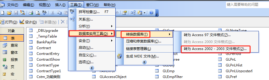 2、进入到表界面后,点击菜单栏【工具】- 【数据库实用工具】-【转换数据库】-【转为Access2002-2003文件格式】,将数据库转换为新的AIS文件后点击【确定】即可。如下图所示: