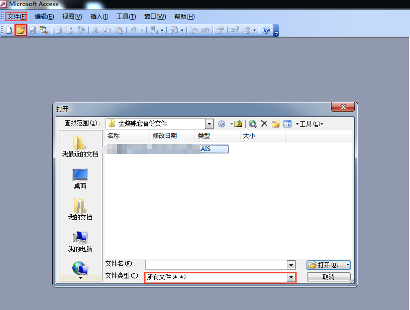 1、可进入Access2003数据库中,【文件】 - 【打开】AIS账套文件,morningstar密码为ypbwkfyjhyhgzj。如下图所示: