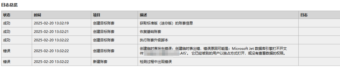 标准版/迷你版升级专业版提示创建临时表发生错误,已经被别的用户以独占方式打开。如下图所示: