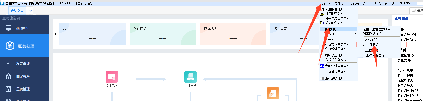 2.点击账套右上角【文件】-【账套维护】-【账套恢复】选择备份的AIR文件之后,会弹出选择路径保存AIS格式的文件。