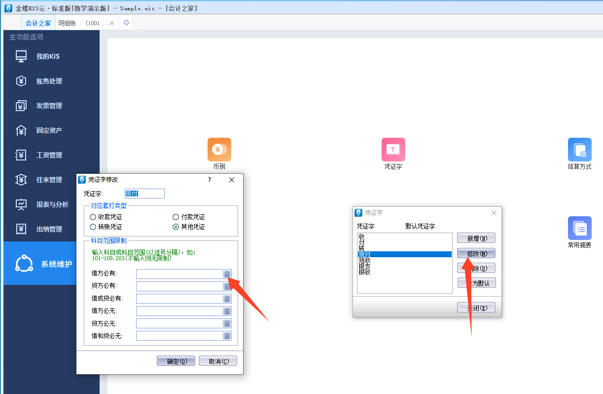点击【系统维护】-【凭证字】修改凭证字,即可设置借方必有某一个科目。