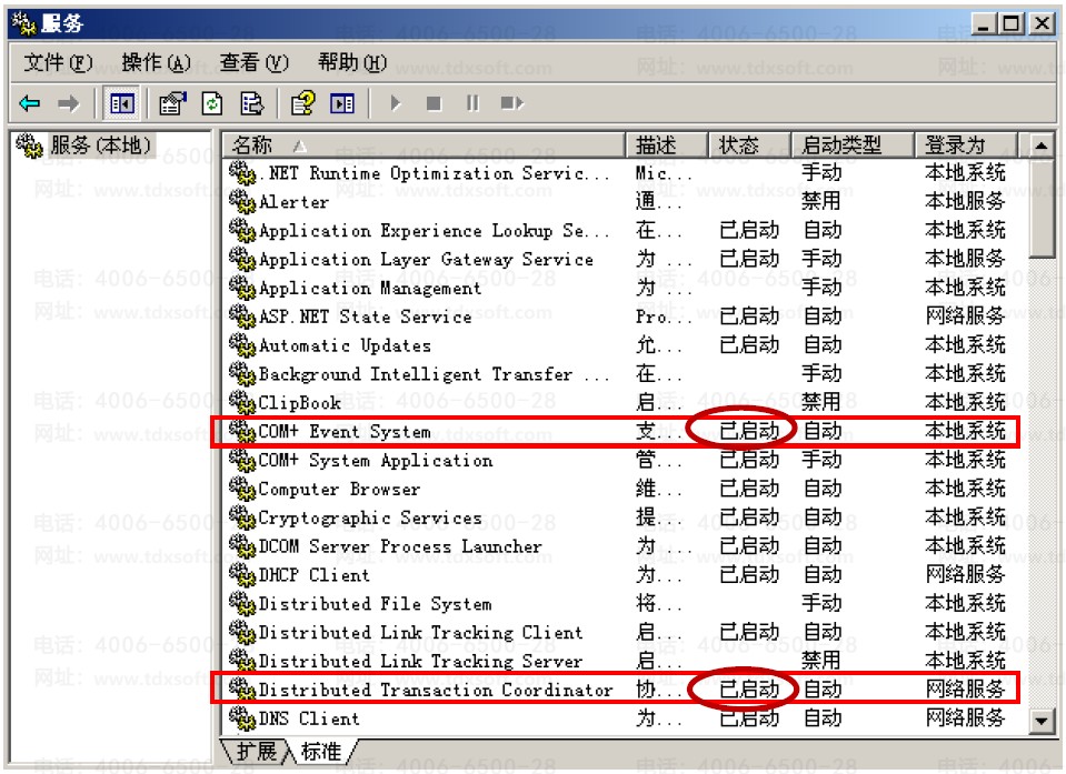 打开【控制面板】→【管理工具】→【服务】,检查 RPC 服务是否启动,动态 COM+是否启动,DTC 服务是否启动,如图 5、图 6:
