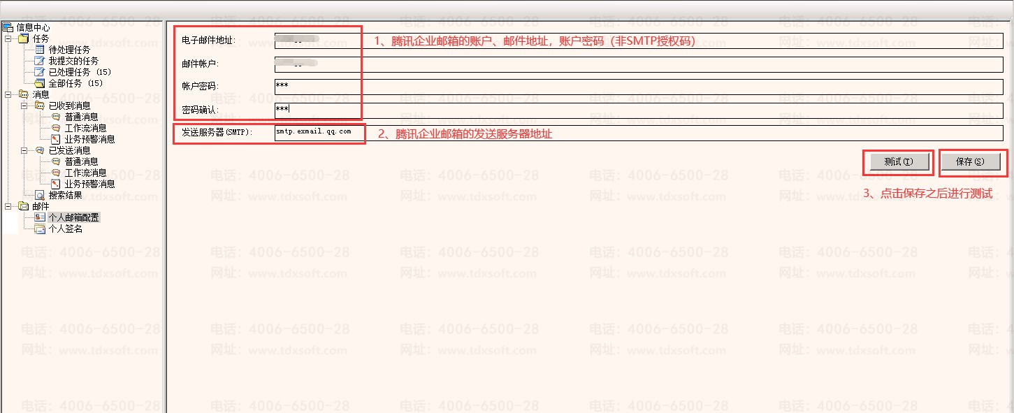 如果使用的是腾讯企业邮箱,可直接设置邮箱账号密码,和腾讯企业邮箱的发送服务器(smtp.exmail.qq.com),保存测试即可,如下图