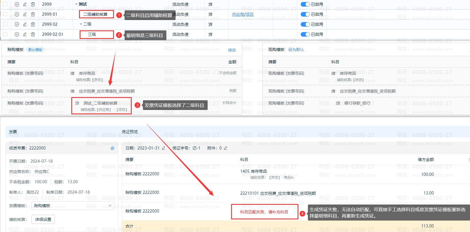 1、科目设置为二级明细科目时,需提前把发票上明细,在【设置】-【科目】新增对应明细科目,否则无法匹配成功。