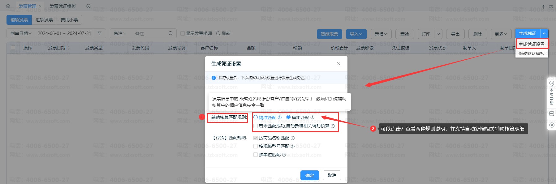 3、点击打开【发票】-【发票管理】,点击右上角【生成凭证】-【生成凭证设置】,设置【辅助核算匹配规则】: