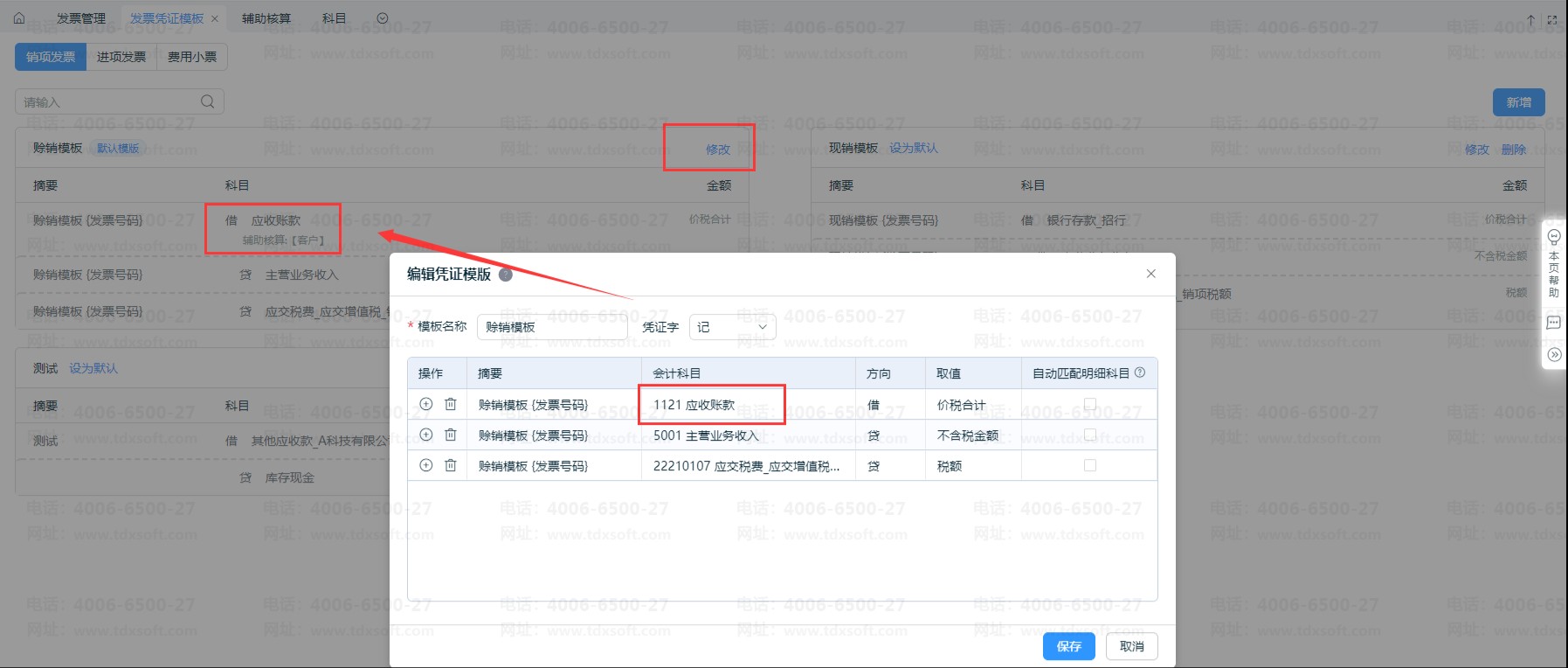 2、如销项发票,应收账款一级科目启用“客户”辅助核算,点击【修改】打开赊销发票凭证模板,选择一级科目即可
