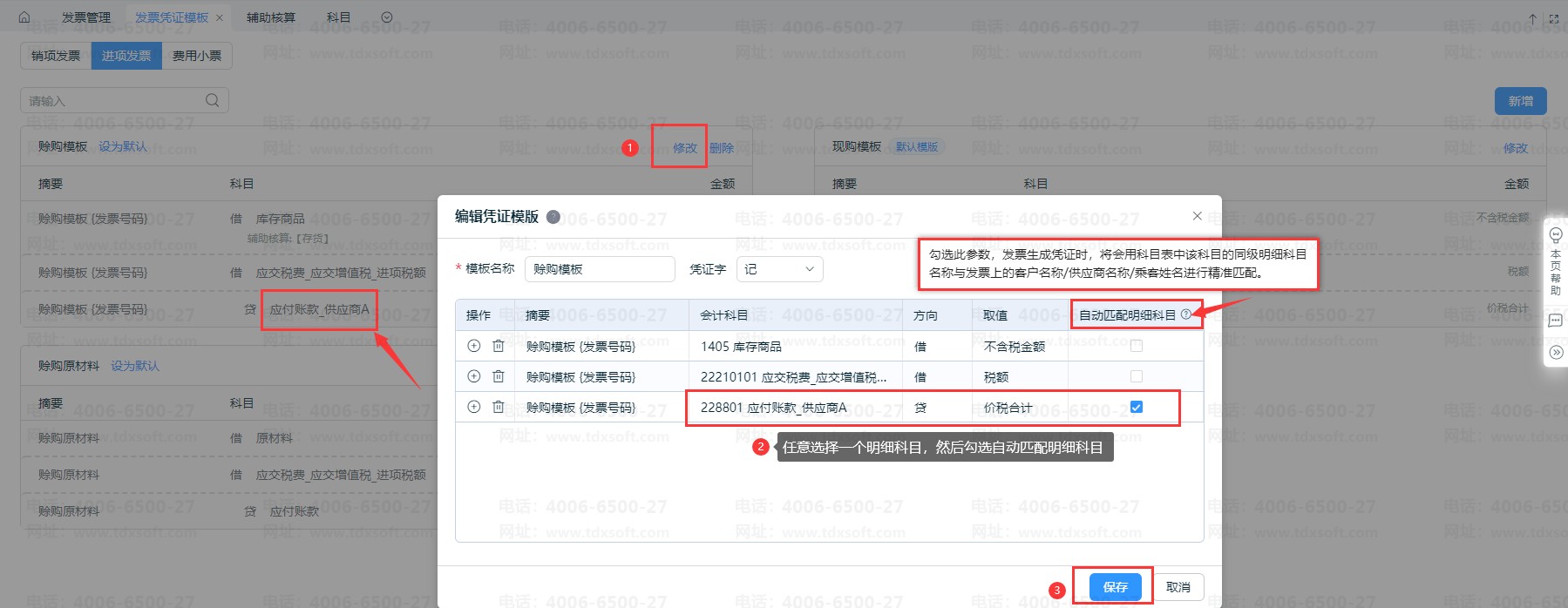 1、同样,打开打开【发票】-【发票凭证模板】界面,如应付账款科目设置的是二级明细科目,点击【修改】打开赊购发票凭证模板,选择其中一个二级科目,并勾选【自动匹配明细科目】。