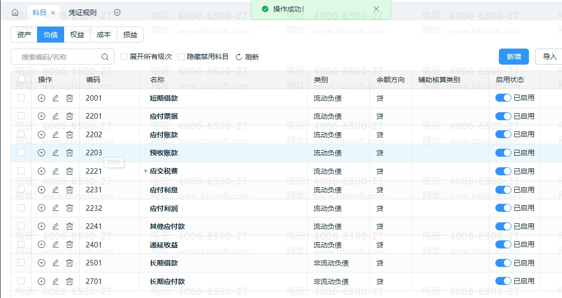 步骤三:修改完成之后,再回到科目页面,删除应付职工薪酬科目,删除提示操作成功,就是成功删除了应付职工薪酬科目。