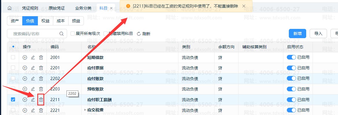 这是因为“2211应付职工薪酬”科目是系统预置科目,已预置在【工资模块】的【凭证规则】内,作为生成凭证的科目,所以删除时提示已被工资模块使用。