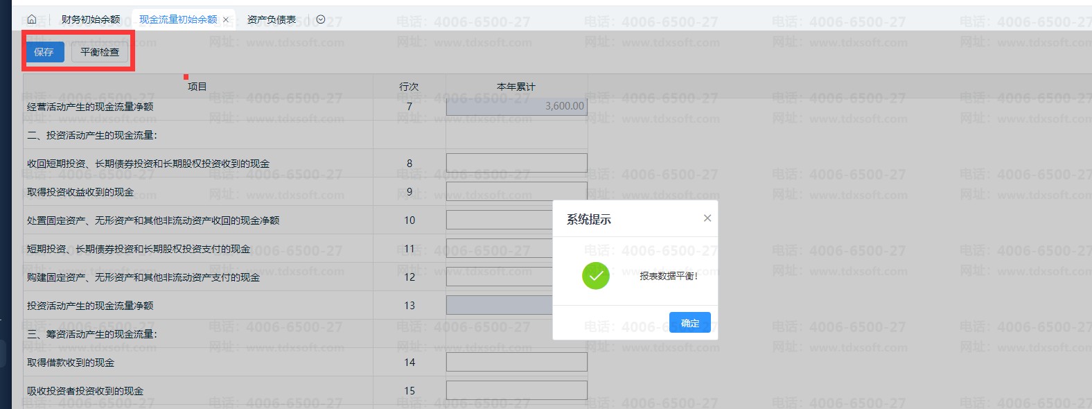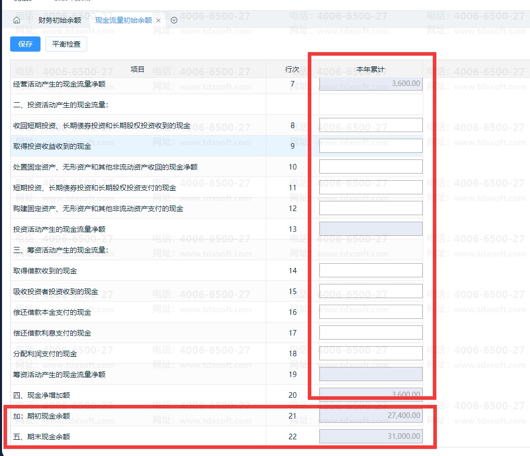 而现金流量初始余额的期末数=现金流量初始余额的期初数+现金流入本年累计发生额-现金流出本年累计发生额,根据自动获取的期初数及手工填入的现金流入/流出的本年累计发生额计算