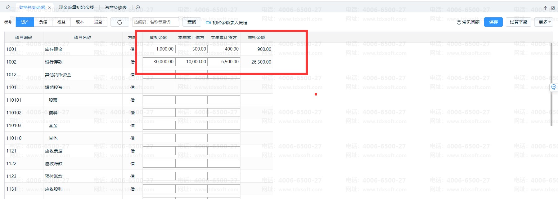 系统可根据已录入的资金类科目财务初始余额自动获取现金流量初始余额期初数(点击查看财务初始余额录入流程)
