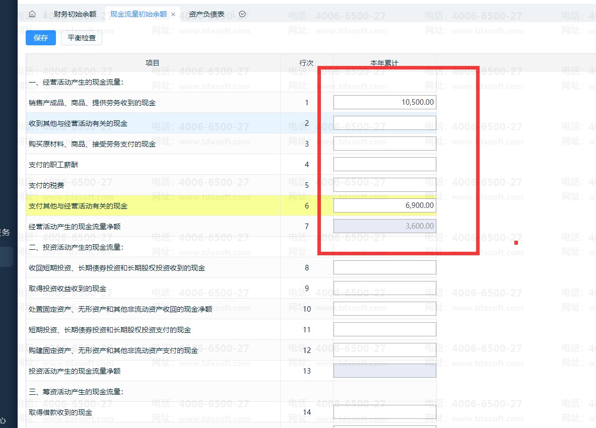 财务初始余额中资金类科目本年累计贷方发生额合计=6900
