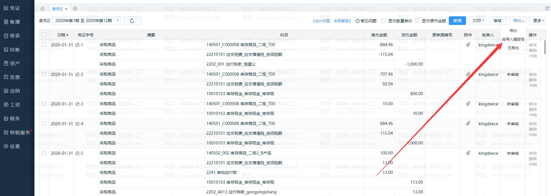 2、导入成功后,进入最新一年的账套(如2020年),在【查凭证】把2020年一整年的凭证筛选查询出来后,右上角【导出】,选择【按导入模版格式导出】,把一整年的凭证导出Excel表格备用。