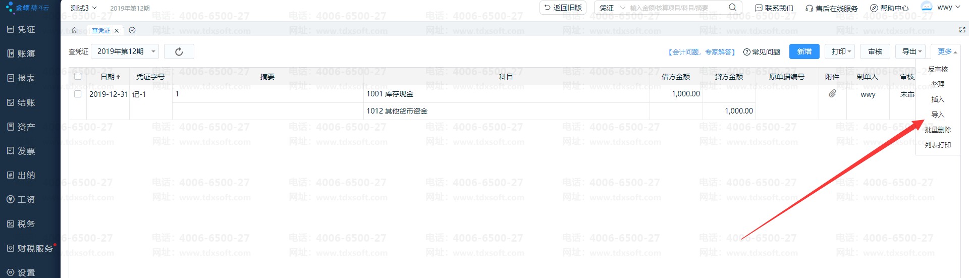 5、2021年账套的凭证,也是按上面的步骤2,3,4操作,把凭证导出来后, 导入到最早一年(如2019年)的账套里。