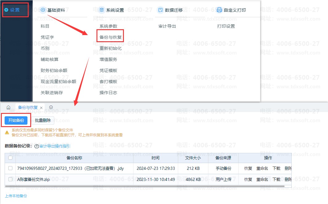 使用账套系统管理员账号,在【设置】-【备份与恢复】中点【开始备份】,可以将当前账套备份完成。