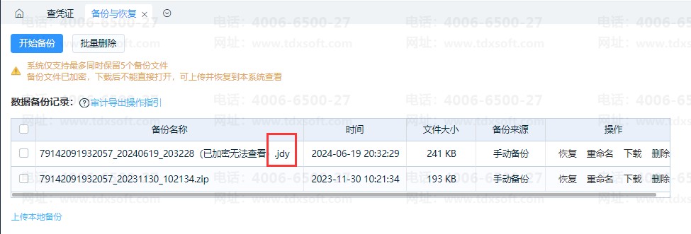 4、备份文件支持重命名和删除,重命名和删除后不影响当前账套及其他账套的数据,若需删除备份,建议下载存档后删除,删除后无法找回。