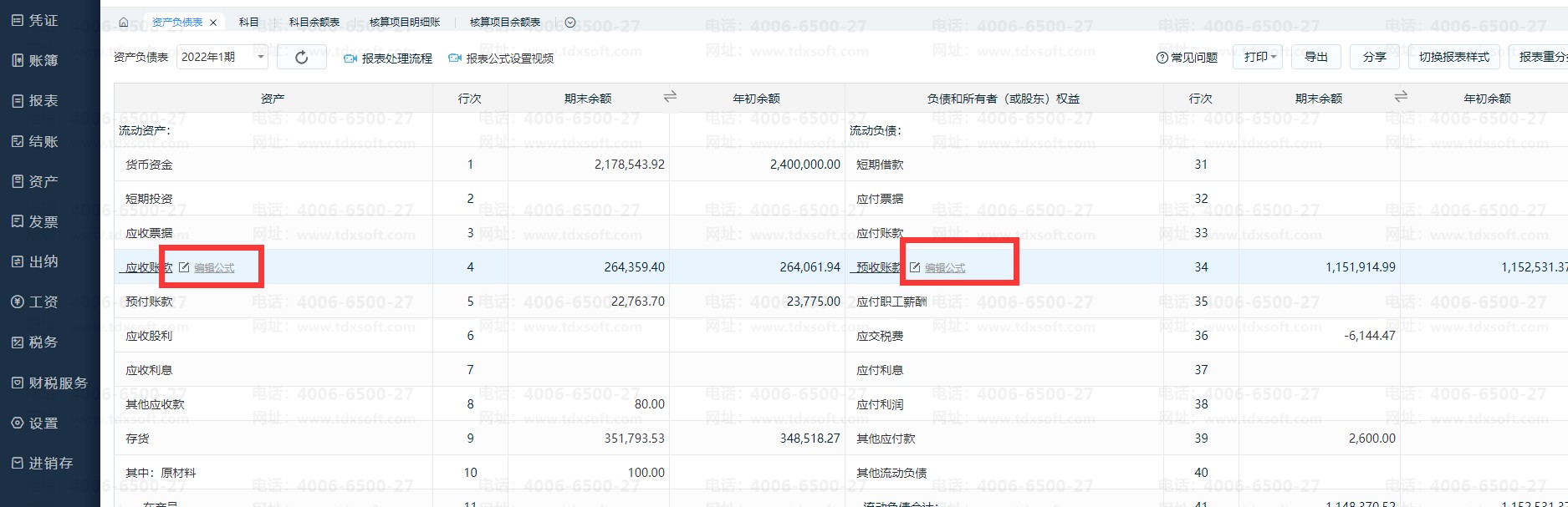 资产负债表做报表重分类,默认将应收账款与预收账款、应付账款与预付账款做为重分类的对应科目,其公式为: