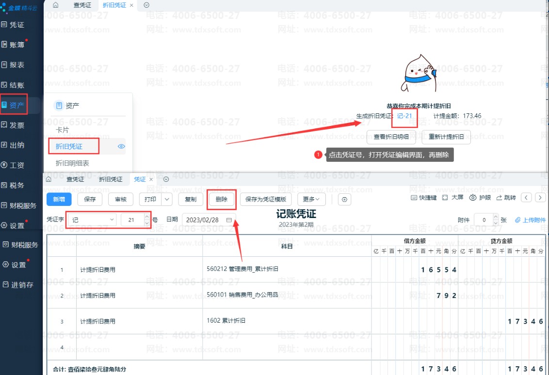 在【资产】-【折旧凭证】,点击凭证号,即可打开折旧凭证编辑界面,直接【删除】即可